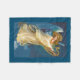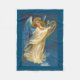 pintura del vintage de un ángel con la expresión angelical, el vestido que fluye hermoso y la arpa de oro en azules y beige.