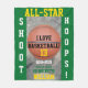 I Love Basketball (Me encanta el básquetbol) está escrito en tipografía negra contra el baloncesto naranja en el centro sobre un fondo fresco y brillante. Fondo verde claro. Año escolar escrito en blanco. All-Star, Número del jugador y Nombre escrito en tipografía de color dorado amarillo. Para cambiar el color de fondo al color del equipo, haga clic en Personalizar y haga clic en Fondo a la izquierda y seleccione de la paleta de colores o escriba un número de color de código hexadecimal. Para cambiar el nombre de la escuela y el color de la mascota que coincida con el color de la fuente verde a su color de equipo, haga clic en el campo Capa de texto del lado izquierdo y seleccione de la paleta de colores del texto del lado derecho. Shoot Hoops está escrito en color blanco. Fotografía original y diseño © 2017, 2018 TamiraZDesigns.
