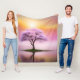 Un hermoso cerezo de flores rosas florece en una pequeña isla en un lago, mientras el sol se eleva en un cielo rosa, naranja y amarillo en esta hermosa manta de lana.