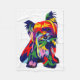 Abrace para arriba con un arco iris colorido Yorkie en una noche fría del invierno.