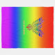Una manta de lana LGBT con un diseño edificante. Utiliza un fénix de arco iris estilizado de aspecto grabado en relieve, alas estiradas a medida que se eleva. Está en un fondo arcoiris a juego. Un estilo perfecto para una siesta de energía preglam.