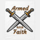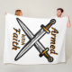 Esta manta de lana muestra las palabras "Armados con fe" en un frente de impresión único con contorno naranja de letras negras con un conjunto de espadas cruzadas unas sobre otras en el centro con este tema de citas basadas en la fe. Esta manta está hecha de una pulga de poliéster 100% suave y acogedora de carnicería, con impresión de sublimación de color vibrante de borde a borde y cosido de doble filo con una máquina trasera de color blanquecino lavable.