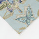 Diseño vintage moderno con un fondo azul pálido pastel francés, mariposas estilizadas de estilo Art Nouveau colgadas con "joyas" colgadas y un pavo real de cola completamente extendida que juntos forman un clásico patrón de repetición de diseño de vieiras sobre un Art Deco, arte de línea dorada con un arco de flores y follaje de hojas de bambú. Creado por la artista y diseñadora con licencia internacional Audrey Jeanne Roberts ©