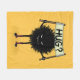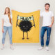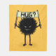 Una manta enorme con un monstruo malvado lindo - un personaje peludo sonriente de la familia del Malvado Flor Bug. Lleva un cartel con el mundo escrito a mano "¿Abrazo?". Esta criatura rara amigable tiene calcetines lindos y sin mangas solamente para mantener sus pies calientes en este mundo poco amigable.