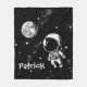 Esta es una manta de lana divertida para un niño que ama el espacio y los astronautas. Es un ilustracion simplista en blanco y negro de un astronauta en el espacio con la Tierra en el fondo. El nombre de la manta es personalizable y sería un gran regalo personalizado.