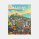 Diseño de viaje vectorial retro en Atenas. La ciudad sigue dominada por monumentos del siglo V a.C., incluida la Acrópolis, una ciudadela en lo alto de una colina coronada por antiguos edificios como el templo del Partenón.