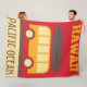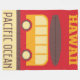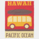Un diseño retro de la diversión de un pequeño autobús con una tabla hawaiana en el top contra un fondo rojo. El texto Hawaii en el Océano superior y Pacífico en la parte inferior.