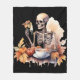 Un esqueleto espeluznante con una taza de café, calabazas y hojas de otoño.