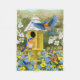 Un par de pájaros voladores orientales hacen su hogar en una bonita casa de pájaros amarillos dentro de un hermoso jardín primaveral lleno de margaritas azules y amarillas y rodeado de madera de dogwood florida. Naranjas y mariposas azules también visitan las flores.