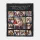 Aprecie los preciados recuerdos de su mejor amigo con esta manta de pulpa de "In Loving Memory". Esta manta conmemorativa del collage de fotos de los personalizados está diseñada para mantener su espíritu cerca, con una hermosa disposición de sus fotos favoritas. El elegante fondo negro y el texto de escritura blanco crean un homenaje sofisticado y conmovedor. Es una manera perfecta de honrar su vida y la alegría que trajeron a la tuya, ofreciendo confort y calidez en tiempos difíciles. Mantén su memoria viva y cercana a tu corazón con este toque único.