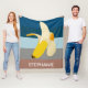 El patrón bananero es un fruto largo y curvo con una corteza amarilla y carne blanca en su interior. Se muestra en un fondo a rayas y se añade el monograma.