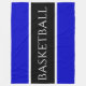 Este diseño deportivo presenta texto BASKETBALL en negrita dentro de una amplia franja central negra resaltada con pinstripes blancas contra rayas exteriores azules brillantes.