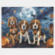 Descanse el espíritu espeluznante con este inquietante diseño de Halloween que presenta una manada de perros bajo un cielo oscuro, iluminado por la luna, rodeados de bates voladores y calabazas brillantes. Perfecto para los amantes de la diversión con sus peludos amigos.