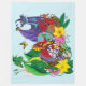 Tres dragones bebés que incuban en un nido de huevos de dragón. Flores y mariposas en un fondo azul alrededor del nido de dragón