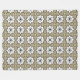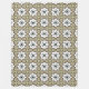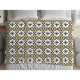 "Two images of decorative towels with geometric floral patterns in beige, white, and black. The first shows hung towels; the second, a folded washcloth."