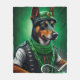 Un amigo peludo detrás de las manillares de una brillante bicicleta verde, usando un traje verde del Día del San Patricio que hace que las cabezas se vuelvan. El perro está vestido con un conjunto festivo, con una corbata verde de arco y un sombrero superior a juego que se sienta cómodos sobre su cabeza. El conjunto presenta un diseño intrincado de rocas de champú y leprechauns, lo que deja claro que este perro está listo para celebrar el Día de San Patricio con estilo.