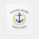 Manténgase cálido y acogedor envuelto en esta manta de lana con temática náutica con su bienvenida personalizada a bordo del saludo y su nombre de barco, apellido u otro texto deseado. Cuenta con un ancla de barco vintage de diseño personalizado enmarcado en hojas de laurel de estilo dorado y estrella para completar el diseño. Viene en blanco o cambia fácilmente el color principal para que coincida con la decoración o el tema actual.