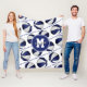 Esta bonita manta de mimbre con temática de baloncesto presenta un patrón reflejado de baloncesto que alternan paneles azules y blancos de colores - la frase "La cancha de baloncesto es mi lugar feliz" en un tipo de letra casual escrita a mano junto con formas cardíacas en estiramientos azules entre las hileras anguladas de baloncesto - el nombre del atleta y el monograma se pueden personalizar en la gran pendiente de círculo sobre - reemplazar el personalizable es blanco - fácilmente el monograma con la carta de varsity del jugador o número jersey - de katz_d_zynes