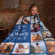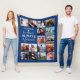 Personalized couples fleecy blanket featuring a stylish blue background that can be changed to any color, 16 photos of your choice, the name of the recipient, a white heart symbol, and the sweet text that reads "be mine, always & forever".