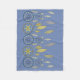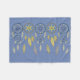 Decorative blue and yellow dream catchers and feather design on light blue fleece blanket.