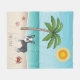 El original ilustracion personalizado de Destei de un lindo perro de raza Boston Terrier color abrigo azul y blanco parado en una playa tropical de verano. En la arena de color beige hay una palmera, una concha rosa, una estrella de mar y un cangrejo rojo. El agua es azul turquesa con algunas olas y el sol brilla por encima del horizonte. También hay un área de texto personalizable para un nombre.