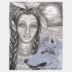 Una mujer elfa indígena y su fiel guardián, un lobo azul mágico, se encuentran en un campo abierto bajo la luz de la luna pálida. No tienen miedo ya que comparten este especial este momento fuera de tiempo. Por ahora, no hay repentino impulso de esconderse, no hay deseo de huir y cubrirse el arbusto silvestre, corriendo y hundiéndose a través de un denso crecimiento forestal bajo los árboles. Cada uno de ellos obtiene fuerza y seguridad al lado del otro. Sin embargo, la mirada penetrante y de ojos dorados del lobo sigue siempre atenta. Reproducción bajo licencia de un dibujo original de la artista Joyce Jackson. Copyright Joyce Jackson. Todos Los Derechos Reservados. No ser reproducido o utilizado sin permiso expreso del artista. Los honorarios de regalías con licencia se pagan al artista por el uso de este diseño.