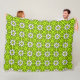Bright green and white floral-patterned towels with daisies are displayed; one hanging on a rod, the other folded, evoking a fresh, cheerful vibe.