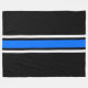 Este diseño deportivo presenta una franja central azul brillante realzada con pinstripes flotantes en blanco sobre un fondo negro.