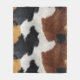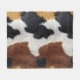 Fleece blanket design featuring an Image of brown, black, and white cowhide texture print.