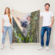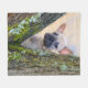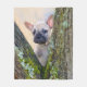 Un cachorro de matón francés de ocho semanas de edad, hembra de color afeitado, mira curiosamente a través de una bifurcación cubierta de musgo de un árbol. Esta manta es una idea de regalo encantadora para los amantes del perro y del Bulldog francés. Un popular perro compañero fotografiado por Katho Menden.