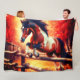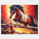 Un caballo poderoso salta en el aire sobre una cerca de madera, su forma muscular resaltada por tonos dorados y naranjas ardientes contra un fondo otoñal brillante. La melena fluida, la postura dinámica y la iluminación intensa crean una sensación de velocidad y fuerza que captura el movimiento crudo con un impacto visual sorprendente.