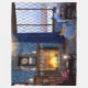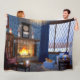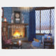 Un acogedor rincón de lectura en un día de invierno nevado, con un gato jengibre sentado mirando al fuego abrasador. Alrededor de la chimenea hay sillones mullidos con velas y pilas de libros brillantes y una taza humeante para completar el confort. Fuera de un sauce cubierto de escarcha y de una cubierta de hayas están oscurecidos por la caída de la nieve.