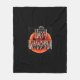 Este dibujo gráfico, editado por fotos, realza esta imagen de Menacing, de calabaza sonriendo, en naranja, amarillo, negro y gris, colores con Feliz Halloween, Emblazado, al otro lado del frente, con letras macabras y blancas.