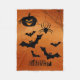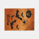Diseño de Halloween con calabaza negra malvada, murciélagos y araña sobre un fondo naranja