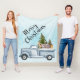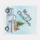 Una manta con un diseño festivo. Camión con Navidades de pinos junto con algunos animales de bosque. Un oso, un zorro y un ciervo parados en la parte de atrás yendo a dar un paseo. Diseño creado con acuarelas.