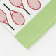 Esta manta tiene un diseño divertido con raquetas de tenis cruzadas en rojo y está lista para que usted la pueda personalizar con un nombre. La leyenda que acompaña a la foto es simplemente "Come, duerme, tenis" o también puedes personalizar esto. El fondo tiene amplias rayas en verde claro y blanco, y hay más patrones de tiras encima y abajo de las raquetas de tenis.