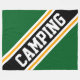 Este diseño deportivo presenta texto atlético CAMPING dentro de bandas de carreras anchas diagonales en blanco, negro y amarillo dorado contra fondo verde del bosque. Las letras primera y última del texto salen de los bordes de diseño con un efecto de pancarta dinámico.