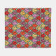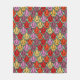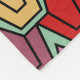 Esta manta de lana tiene un diseño art deco de tulipanes de pentagones y trapezoides en naranja, rojo, púrpura, dorado y verde.