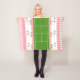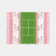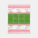 Dulce manta para bebés con tema de tenis, con lindas corderos rodeando una pista de tenis con fondo de rayas rosas.