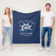 Una manta de lana azul y blanca con un casco de barco y olas oceánicas. Gran decoración para el propietario de un yate o para cualquier marinero. Personalízalo añadiendo tu nombre, tu nombre de barco y la ciudad en la que navegas.