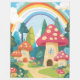 Casas de setas con gorras rojos, marrones y azules con manchas blancas. Un cielo azul con arcoiris. Bonito toque en la pared de un dormitorio para niños.