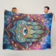 An artistic and detailed representation of the hand of Fatima, a powerful symbol of protection and good fortune, adorned with intricate designs and an all-seeing celestial eye.
