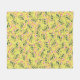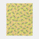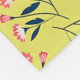 Patterned design with pink flowers and dark green leaves scattered on a bright yellow background. The floral motif is cheerful and lively.