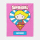 Echa un vistazo a la Chibi Supergirl parada frente a un corazón de estallido azul y blanco, sobre su S-Shield con el nombre por encima.