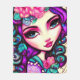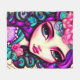Es una manta de pulpa divertida con un ilustracion caprichoso de un chica de color morado, rosa y turquesa.