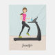 El diseño de ilustracion de Destei de un lindo chica de morena que corre en una cinta de correr. La chica tiene el pelo largo marrón que está en la cola de un ponytail, lleva puesta una camisa rosa, piernas negras y zapatos deportivos verdes. La cinta de correr es negra y tiene una botella de agua azul. También hay un área de texto personalizable para un nombre.
