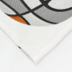 Esta bonita manta de pulpa con temática de baloncesto presenta imágenes realistas de baloncesto que tienen paneles naranjas, blancos y grises alternados dispuestos en un patrón espejado anglorizado - la frase "La cancha de baloncesto es mi lugar feliz" en un tipo de letra casual escrita a mano en franjas grises entre las filas anguladas de baloncesto - el nombre del atleta puede ser personalizado en una banda de color de ancho completo y similar fondo es blanco personalizable - de katz_d_zynes