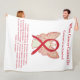 El arte muestra el "Ángel de la cinta roja" para apoyar la conciencia sobre el cáncer de sangre. El arte muestra a un ángel guardián sosteniendo una cinta roja de sensibilización y el poema de "Lo que el cáncer no puede hacer" gira a su alrededor. Las palabras del poema dicen "Lo que el cáncer no puede hacer, el cáncer es tan limitado... No puede paralizar el amor. No puede destruir la esperanza. No puede corroer la fe. No puede destruir la paz. No puede matar la amistad. No puede suprimir recuerdos. No puede silenciar el coraje. No puede invadir el alma. No puede robar la vida eterna. No puede conquistar el espíritu. -Autor desconocido" Haz mantas de pulpa para tu personalizado o como regalo para un ser querido. Añade tus propias palabras o imágenes a esta manta suave de quimioterapia para recibir regalos especiales de la cinta contra el cáncer.