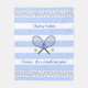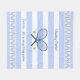 Esta manta tiene un diseño divertido en azul y blanco con raquetas de tenis cruzadas, y está lista para que usted la pueda personalizar con un nombre. La leyenda que acompaña al texto es simplemente "Tenis - es un juego que rompe" o también puedes personalizar esto. El fondo tiene amplias rayas en azul pálido y blanco, y hay más patrones de rayas arriba y abajo de más raquetas de tenis.