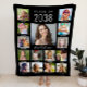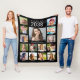 Manta de felpa negra de recuerdo de graduación con un collage de 15 fotos de la graduada a través de sus años escolares y su nombre en una elegante letra cursiva blanca. Agrega tus leyendas personalizadas debajo de cada foto.